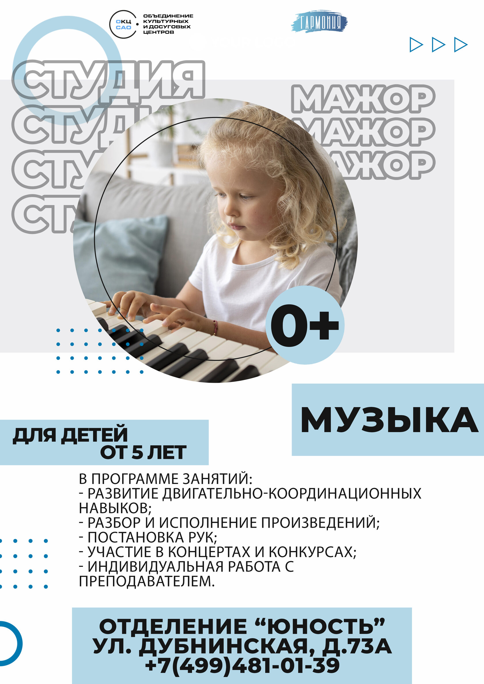 Занятия в студии направлены на развитие у детей эстетического восприятия, любви к музыке и умения играть на фортепиано через знакомство с лучшими произведениями российских и зарубежных композиторов.