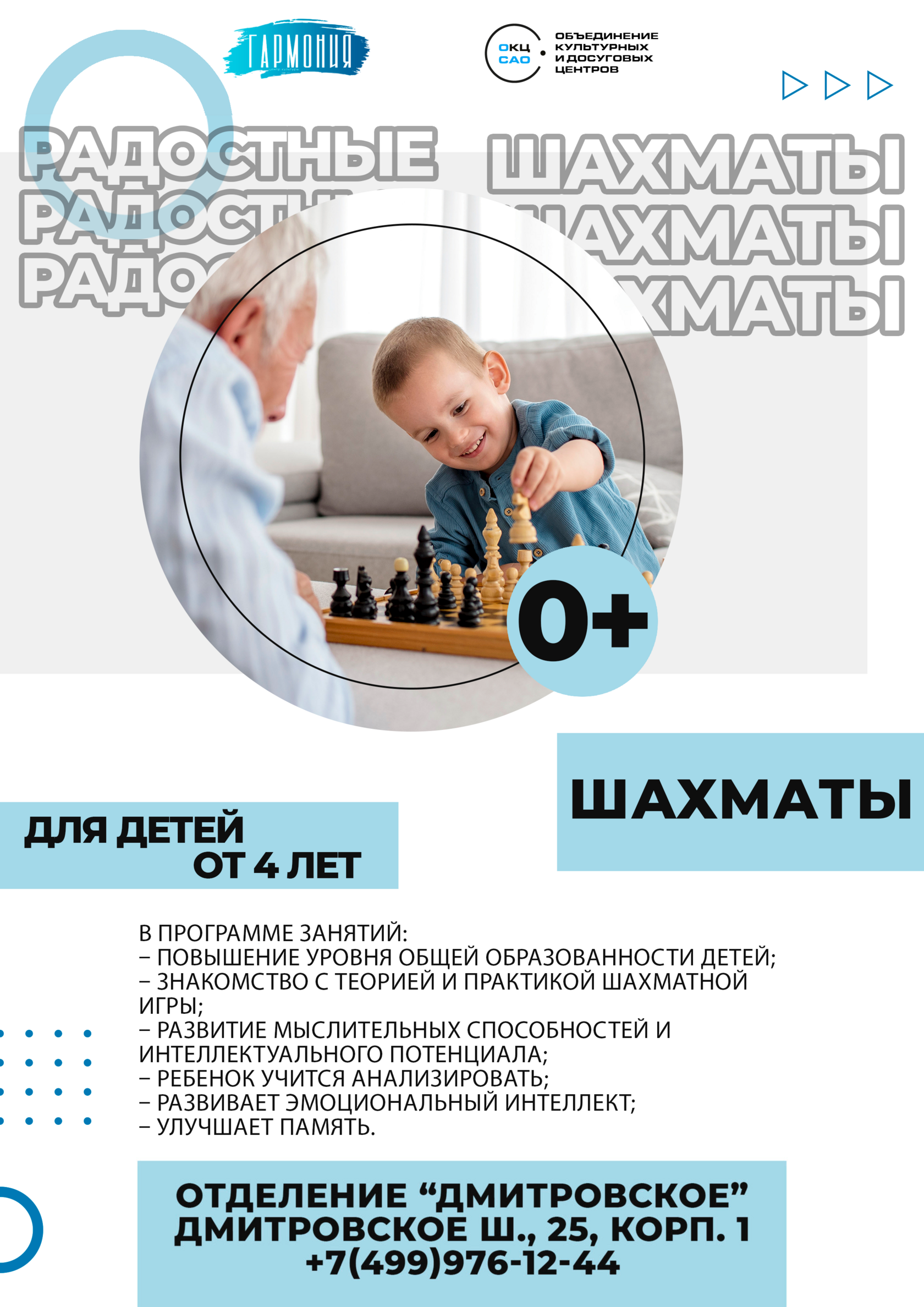 Занятия в студии шахмат рассчитаны на детей от 4 до 17 лет. В студию принимаются дети с различной степенью подготовки. Занятия включают в себя повышение уровня общей образованности детей, знакомство с теорией и практикой шахматной игры, развитие мыслительных способностей и интеллектуального потенциала детей.