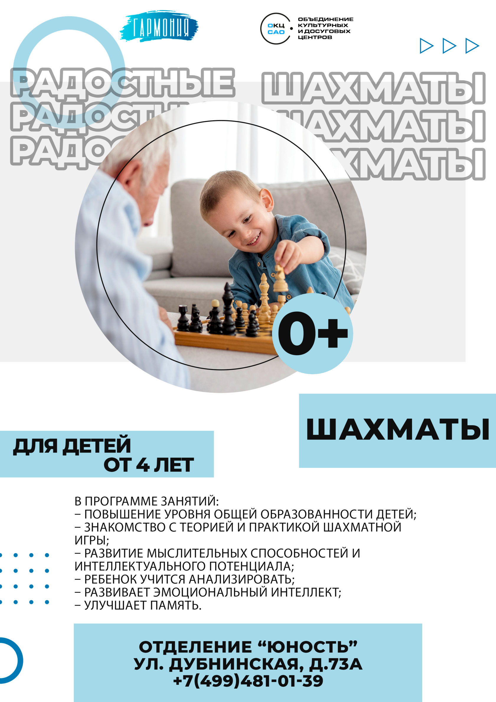Занятия в студии шахмат рассчитаны на детей от 4 до 17 лет. В студию принимаются дети с различной степенью подготовки. Занятия включают в себя повышение уровня общей образованности детей, знакомство с теорией и практикой шахматной игры, развитие мыслительных способностей и интеллектуального потенциала детей.