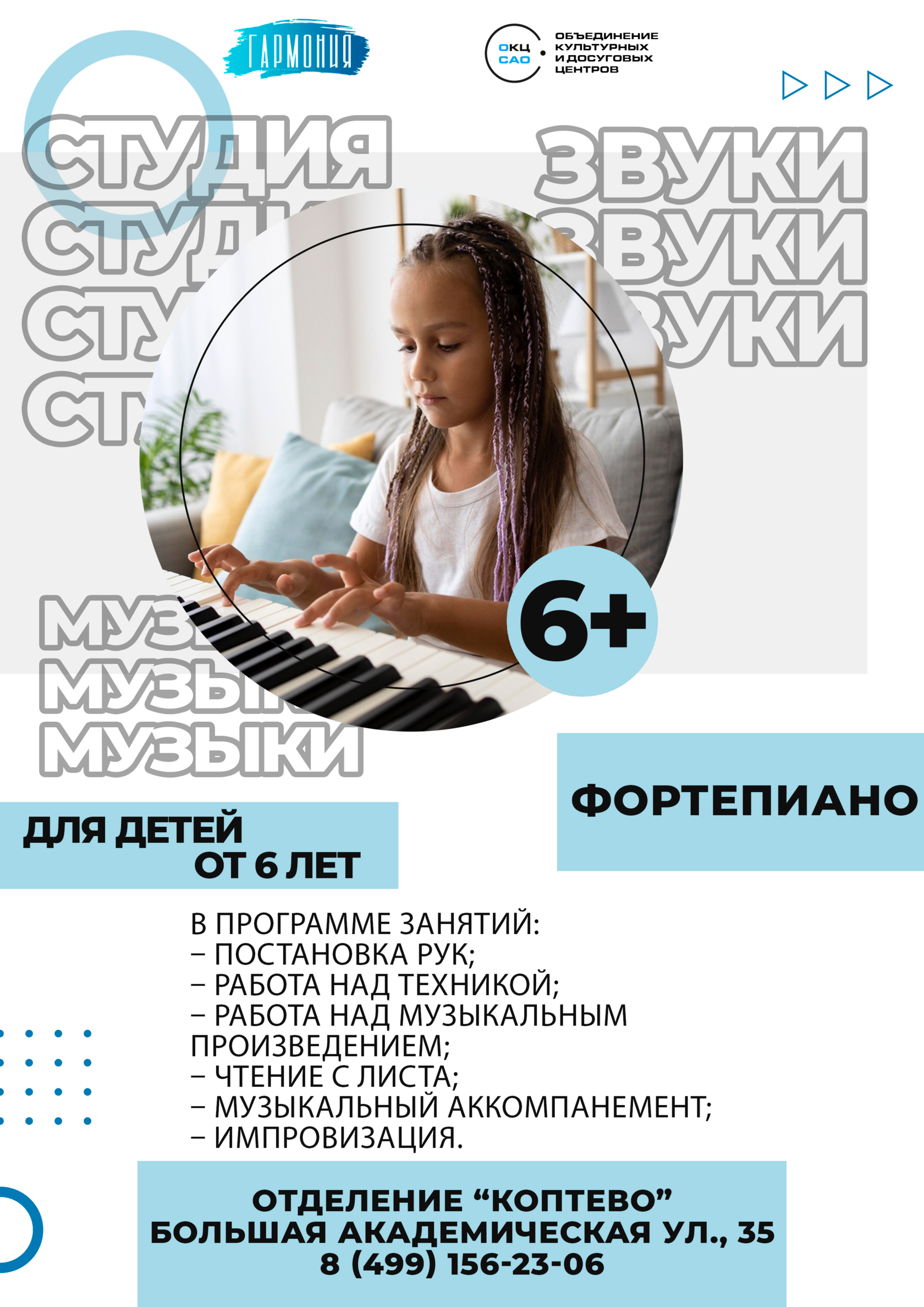 В процессе занятий в студии учащиеся овладевают техническими приемами игры на фортепиано (двигательные навыки, приемы звукоизвлечения), а также учатся правильно понимать характер исполняемых произведений.